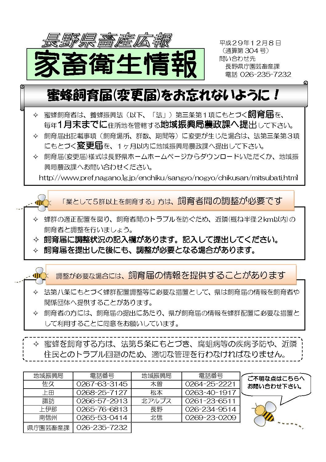 養蜂振興法の規定により、蜜蜂飼育者は毎年1月末までに蜜蜂飼育届を提出することとされています。 蜜蜂飼育者におかれましては、別添の長野県畜産広報をご覧いただき、佐久地域振興局農政課へ蜜蜂飼育届の提出をお […]